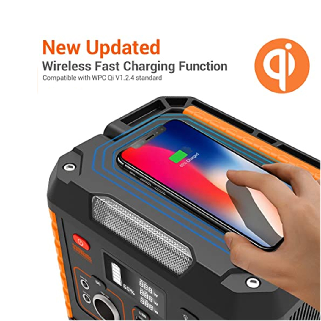 The top of the portable camping generator is designed as a wireless charger that means you can use our portable power station as a wireless charger to recharge your mobile phone .